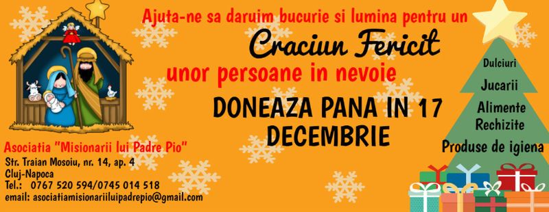 Intru-cat ne aflam deja in timpul Postului Craciunului si incepem sa numaram zilele pana la marea sarbatoare a Nasterii Domnului, cu mare bucurie si speranta, gandul nostru se indreapta inca o data spre acele familii unde este mai mare si mai multa nevoie, ca spiritul Craciunului sa fie adus in case si in suflete! De aceea, Asociatia "Misionarii lui Padre Pio" lanseaza in aceasta seara, o noua campanie caritabila intitulata "Sa daruim bucurie si lumina pentru un Craciun Fericit !", avand ca simplu scop sa ducem bucuria si spiritul sarbatorile, in cat mai suflete greu incercate si intristate, cu mai multe actiuni pe care ni le propune pentru acest timp binecuvantat! Iata despre ce este vorba: